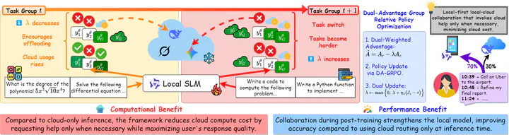 Locally deployed Small Language Models (SLMs) must continually support diverse tasks under strict memory and computation constraints, making selective reliance on cloud Large Language Models (LLMs) unavoidable. Regulating cloud assistance during continual learning is challenging, as naive reward-based reinforcement learning often yields unstable offloading behavior and exacerbates catastrophic forgetting as task distributions shift. We propose DA-GRPO, a dual-advantage extension of Group Relative Policy Optimization that incorporates cloud-usage constraints directly into advantage computation, avoiding fixed reward shaping and external routing models. This design enables the local model to jointly learn task competence and collaboration behavior, allowing cloud requests to emerge naturally during post-training while respecting a prescribed assistance budget. Experiments on mathematical reasoning and code generation benchmarks show that DA-GRPO improves post-switch accuracy, substantially reduces forgetting, and maintains stable cloud usage compared to prior collaborative and routing-based approaches.