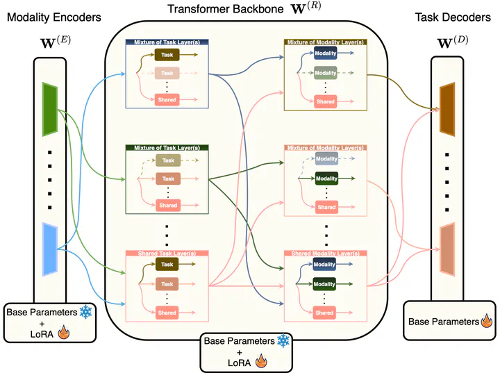 Federated Learning (FL), despite demonstrating impressive capabilities in the training of multiple models in a decentralized manner, has been shown to produce a final model not necessarily well-suited to the needs of each client. While extensive work has been conducted on how to create tailored personalized models, called Personalized Federated Learning (PFL), less attention has been given to personalization via fine-tuning of foundation models with multi-task and multi-modal properties. To address this gap, we propose TAP (Two-Stage Adaptive Personalization), which (i) leverages mismatched model architectures between the clients and server to selectively conduct replacement operations when it benefits a client’s local tasks and (ii) engages in post-FL knowledge distillation for capturing beneficial general knowledge without compromising personalization. We also introduce the first convergence analysis of the server model under its modality-task pair architecture. Through extensive experiments, we demonstrate the effectiveness of our proposed algorithm across a variety of datasets and tasks in comparison to a multitude of baselines.